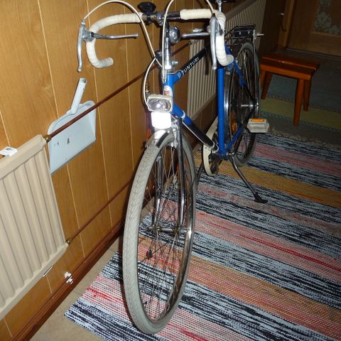 Monark maantiepyörä, punainen runko, valkoinen satula ja valkoinen ohjaustanko. Pyörässä on takalokasuoja, tavarateline ja kapea maantietyyppinen rengas. Sopii maantiepyöräilyyn ja kaupunkiajoon.