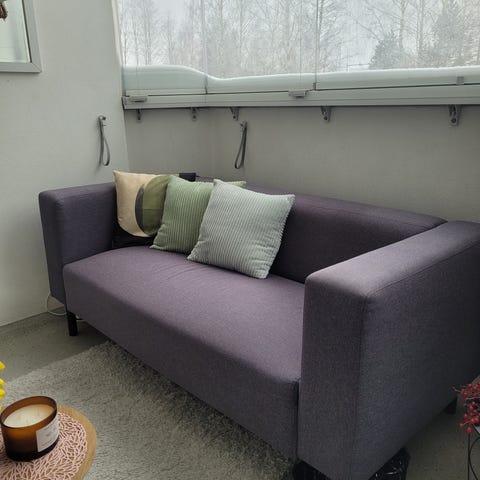3 istuttava kangas sohva. Toisessa laidassa joku tahra, muuten hyvässä kunnossa.