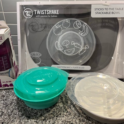 -Twistshake astioita. Lautaset ja alusta jäänyt aikalailla käyttämättä,muki kätetympi,mutta edelleen hyväkuntonen,venttiili valitettavasti hävinnyt