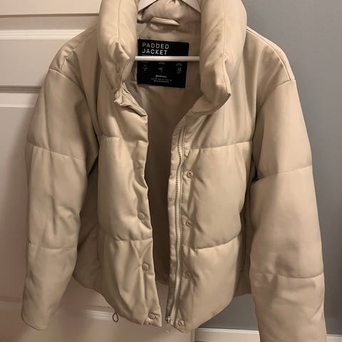 Mustavalkoinen raidallinen suht. pitkä takki, kangas pehmeää ja vähän joustavaa (50% puuvillaa), vuoreton. Edessä taskuissa nepit, alhaalla kiristysnauha, vetoketju ehjä.