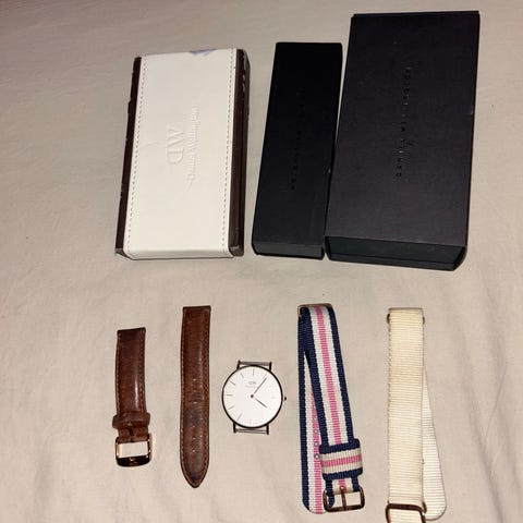 Myyntiin kaapista 2kpl Daniel Wellington -kelloja. Mukaan lisäksi kahdet ylimääräiset nahkarannekkeet joista toiset tuskin ovat aidot.