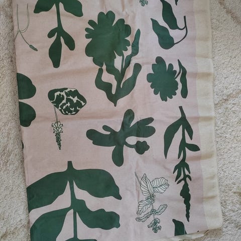 Kangas jossa kulkien värit hentoa vaaleanpunaista, harmaata ja sinertävää. Oranssi väri myös. Sopii verhoksi, pöytäliinana yms. Mmm