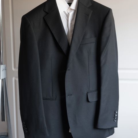 Dressmanin tummansininen puku. Osittain villaa. Meille kuvan kaverille pikkasen iso. Hän nyt noin 176cm ja hoikka. Kuvassa tietoa. Eli vähän rotevammalle kaverille siisti kerran käytetty puku. Puku siisti, jämptisti säilytetty, ei tuosuja, 75 e plus posti