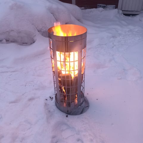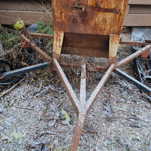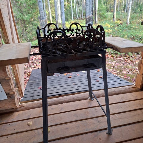 Hieno sepän tekemä tulisija teline. Pitkä runkoputki terävällä kärjellä maahan upotusta varten. Paistotason ja nokipannu koukun korkeus säädettävissä 9 asentoon. Edellä mainitut liikkuvat sivusuunnassa portaattomasti 360 astetta. Puiset kahvat ei polta käsiä.