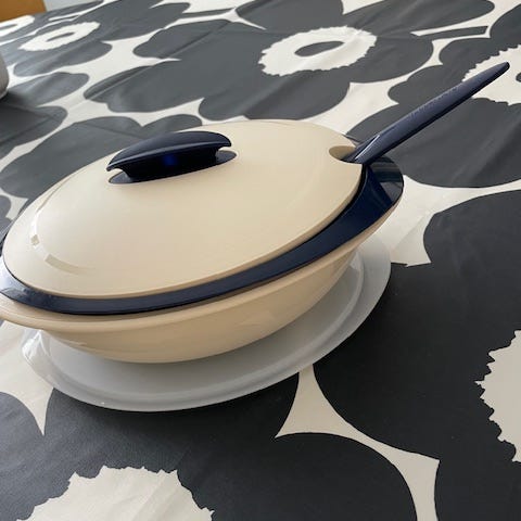 Kannen reunassa on ura, jotta astiat eivät luisu pinottuina.