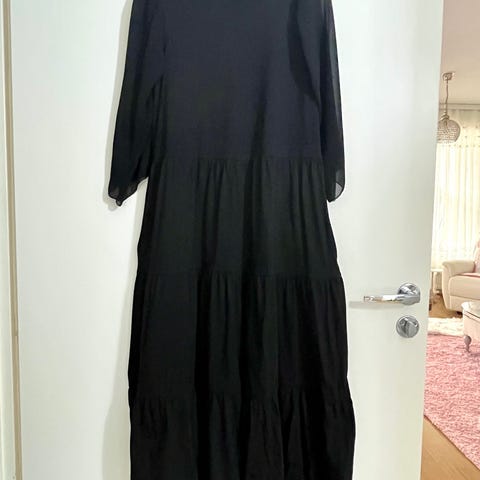 Tummansininen mekko, sivuilla halkiot. Kangas täysin joustava, joten antaa hyvin myöden joka suuntaan. Mekkoon kuuluu vyö