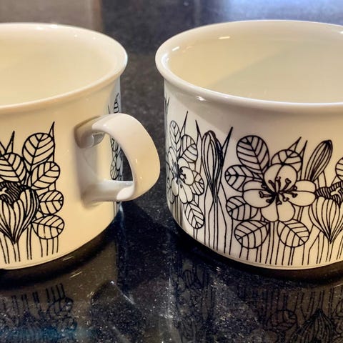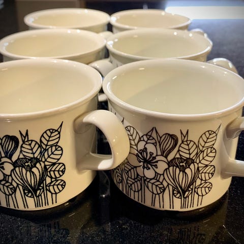Esteri Tomulan suunnittelema Krokus teekuppi tassin ja lautasen kera. 1970-luvun lopun tuotantoa.