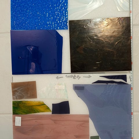 Lentolaukullinen -ja vähän päälle- käyttämätöntä tiffanylasia. Ostettu Tamperelta lasiliikkeestä. Mukaan lasiveitsi, visiiri, plus muuta lasitarviketta.
