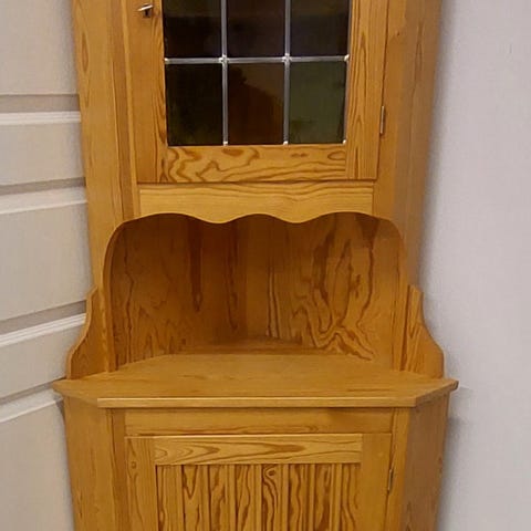 Mäntyinen kulmakaappi. Maalattu laadukailla French chic maaleilla.Kevyt ja yläosan saa irroitettua helposti kuljetusta varten.
