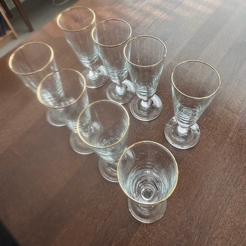 8 jalallista lasia. 6 samanlaista ja 2 hieman erilaista, joissa lukee pohjassa France. Ero näkyy 2.kuvassa, missä lasit rinnakkain.