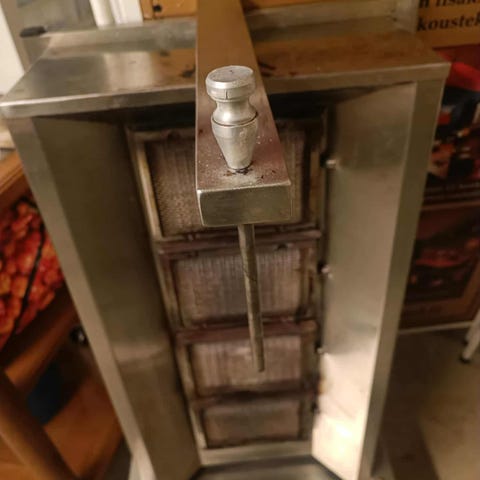 Yksi üstteki levylərden (vastuksista) ei toimi, mutta se ei ole este. Sillä voi silti valmistaa helposti 20 kg kebabia. Kebabkone.