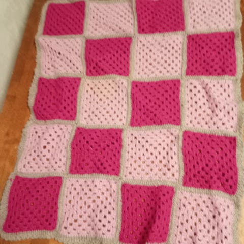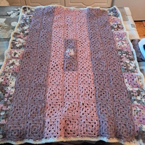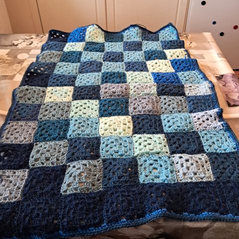 Isoäidin neliöistä virkattu vauvan peitto. Käytin 4 koukkua. Lanka on 100% akryylia, joten peitto on pehmeä eikä pistele. Peiton voi pestä koneessa 30° hellävaraisessa pesussa. Peitto on noin 100cm x 80cm