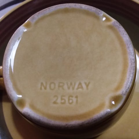 Uniikki teekannu, kolme kuppia ja lautaset, vain yksi kakkulautanen. 1990-luvun alusta. Ilmeisesti Laihialla toiminut silloin keramiikkapaja, josta tuotteet. Nuukailtu; yksi lautanen, ettei mene liikaa kastamista😊. Jollekin täydennystä omaan astiastoon.