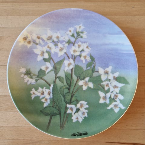 Toivo G. Utriaisen Arabialle suunnittelema Pihajasmike-seinälautanen kuuluu Kukkivat pihapuut sarjaan.