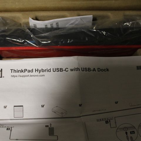 ThinkPad Hybdrid USB-C -porttitoistin, USB-C -liittimen lisäksi mukana on USB-A -adapteri, jolla porttitoistimen saa kytkettyä koneisiin, joista ei USB-C -liitäntää löydy. Mukana 135 wattin laturi.