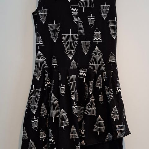 Kotimaisen Second Chancen musta-harmaa mekko, koko S. Materiaali mukavaa, joustavaa mutta paksuhkoa ja hyvin laskeutuvaa viskoositrikoota. Laskostettu, hiukan levenevä helma. Käytetty vähän, kunnossa ei moitittavaa.