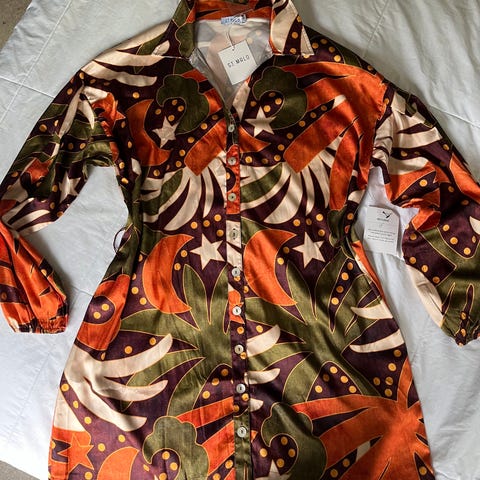 Kevyt jakku kesäiltoihin, läpikuultava materiaali suojaa auringolta ja illan tullen hyttysiltä, 100 % polyesteri, koko L, ostettu Irlannista, toista samanlaista ei tule vastaan, täysin käyttämätön, hintalaput paikoillaan. Hapsut hihansuissa ja helmassa. Pituus niskasta helmaan (hapsujen yläreunaan) 90cm.