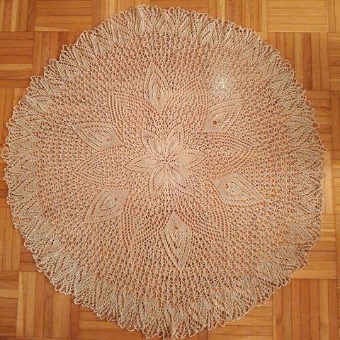 Kaunis beigen värinen virkattu pyöreä pitsiliina. Liinan halkaisija 128 cm