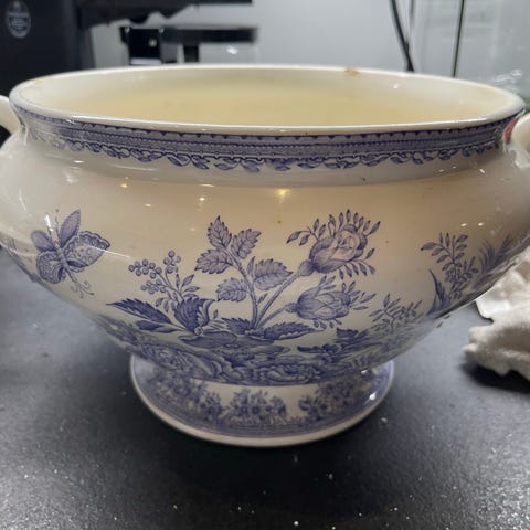 Vanha kannellinen kulho on muuten ehjä, mutta kannessa pientä krakeilua pinnassa ja kulhon sisäpohjassa näkyy ajan patina. Koristeeksi lähes virheetön ollakseen n. 100-vuotias Vain nouto ja käteismaksu, kiitos :)