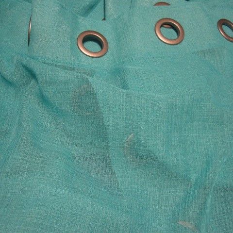 Läpikuultavat pronssinväriset itseommellut sivuverhot. Pituus 300cm, mutta pidetty käännettynä noin 260cm kohdalta. Tämän vuoksi kankaassa on purkaumia nipsujen kohdalla, noin 30-60 cm yläreunasta. Kuvissa pari tällaista kohtaa. Kankaassa musta loimilanka.