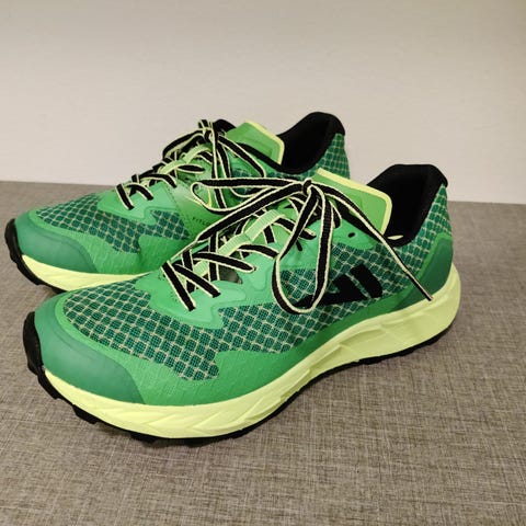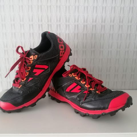 Kotimaisen VJ:n Spark-maastojuoksukengät. Olleet jalassa kolmesti, jotain käytönjälkeä on, mutta yleiskunto erittäin hyvä.