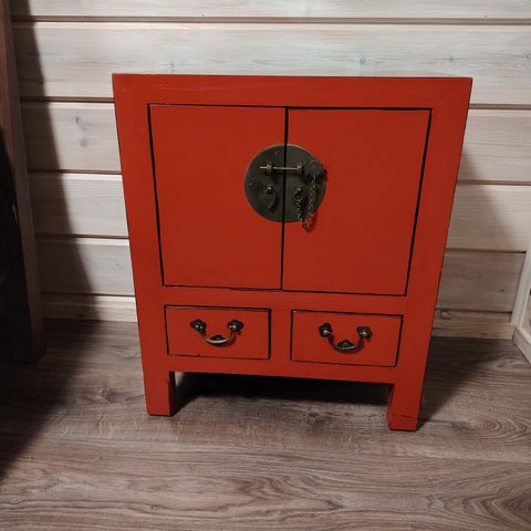 Hyväkuntoinen kiinalainen kaappi, elämän jälkiä näkyy.