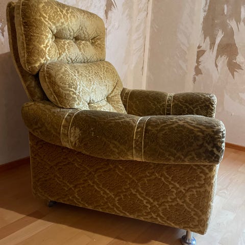 Uudelleen verhoiltu vintage nojatuoli, joka on todennäköisesti 50-60- lukujen vaihteesta. Hyväkuntoinen.