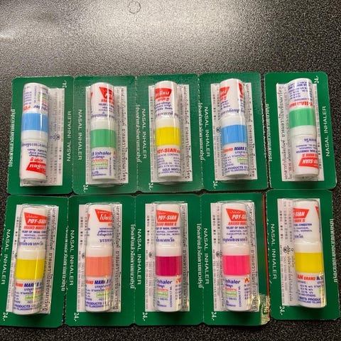 Thaimaalaista yrtti-inhalaattori, joka käytetään usein nenän tukkoisuuteen, huimaukseen tai yleiseen virkistäytymiseen.