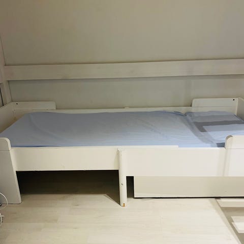 Valkoiseksi maalattu Muuramen jatkettava lastensänky. Alunperin laidat olleet tumman ruskeat.