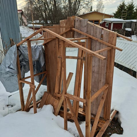 Nyt olisi leikkimökki tarpeettomana. Ulkomitat: pituus 208, leveys 160 ja korkeus 190. Sisämitat 140x140 ja korkeus 155. Pertunmaan kk