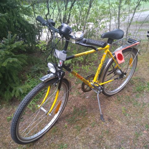 7- vaihteinen, vikaa dynamossa, joka ei palaudu ja vaihdevaijerissa, joka pitäisi voidella. Ykkösvaihteella voi silti ajaa. Rengaskoko 24x19. Avain tallella lukossa.
