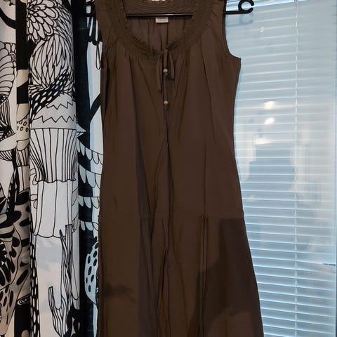 Uusi Esprit -kuviollinen mekko. (Tummansininen pohja, ruskeat kuviot). Koko 34, 10€. Mukana tummansininen alusmekko. Väljä malli, vyötäröä helppo säädellä.