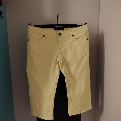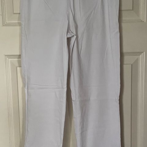 Valkoiset muutoin hyväkuntoiset kesä housut, mutta haaroissa aavistus pesuhaituvaa ja joku olemattoman pieni haalea tahra sääressä. Tyköistuvat. Joustavat farkkumaiset. Nätit päällä.