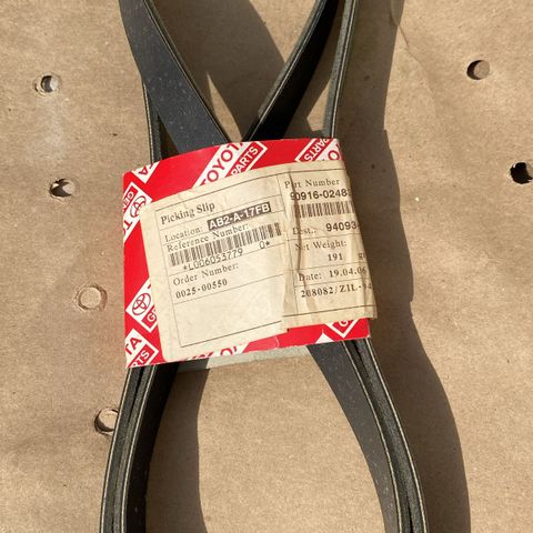 Myydään Toyotan uusi ja alkuperäinen laitehihna, osanumero 90916-02566 (Laitehihna (BELT, V(FOR FAN & ALTERNATOR)). Näitä löytyy kaksi kappaletta, hinta yhdelle kappaleelle. Sopivuus: