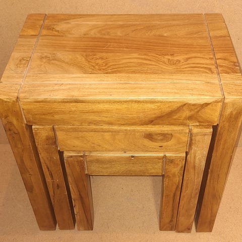 2 kpl Akaasia puisia, täyttä rautaa olevat jakkarat, sivupöydät, kukkapöydät.