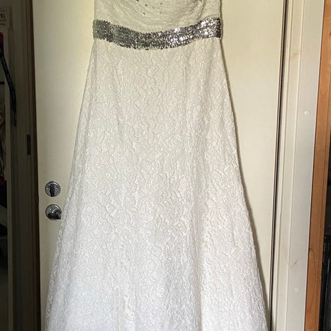 Myydään vain silitystä vailla oleva häämekko, hohtavan valkoinen, olkaimeton. Käytetty pesulassa (SOL). Piilotettu vetoketju takana. Takana laahus, jossa lenkki, että saa laahuksen käteen. Mekon alla kiinteä tyllihame. Rintamuksessa helmiäiskirjailua.