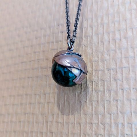 Vaaleanvioletti Kalevala Tintti kaulakoru alkuperäisessä rasiassa ja dokumentit tallella. Pronssinen ketju ja riipus ja liila keraaminen pallo, jonka pinta hieman lysterisen näköinen.
