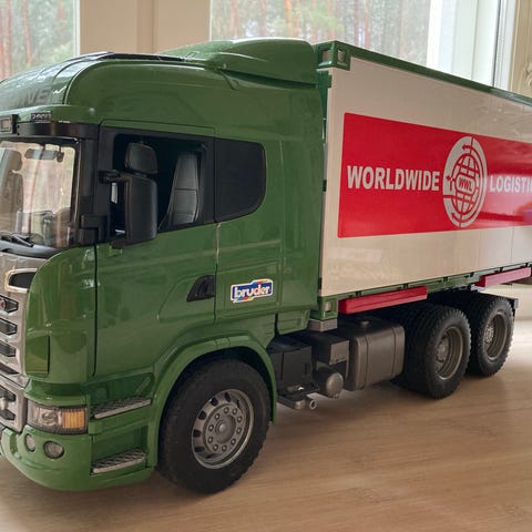 Bruder kuorma-auto lelu, jossa punainen ohjaamo ja vihreä kippilava. Sopii lasten leikkeihin ja on valmistettu muovista. Malli on suunniteltu jäljittelemään todellista kuorma-autoa. Kulunut mutta ulkoleikeissä vielä toimii.