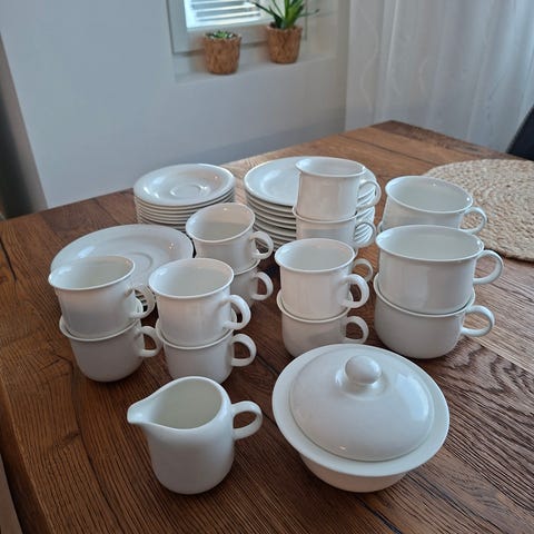 Hyväkuntoiset valkoiset Arabia Arctican kahvikupit+asetit 11 kpl, sokerikko ja kermakko 80-luvulta.