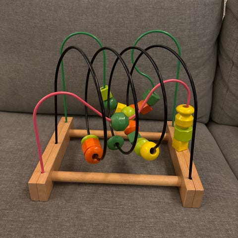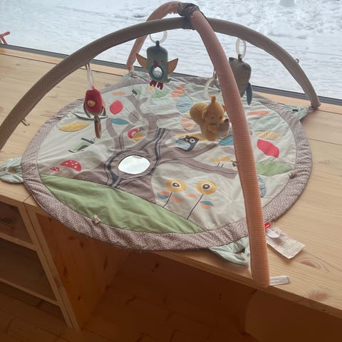 Ehjä vauvan jumppakaari, koivuvaneri/monivärinen. Pari osaa puuttuu, tilalle voi laittaa muita leluja roikkumaan.
