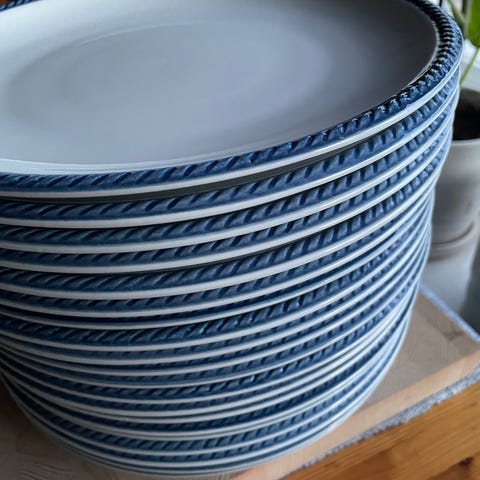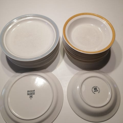 Englantilaistyyliset kahdeksankulmaiset lautaset halkaisija 19cm. Olleet vähällä käytöllä. Neljä kappaletta yhteishintaan 15 euroa. Tuotanto on lopetettu Englannissa ja niitä ei juuri saa rikkoutuneiden tilalle. Pirkko Mannolla kirjoittaa käyttävänsä kyseisiä lautasia.