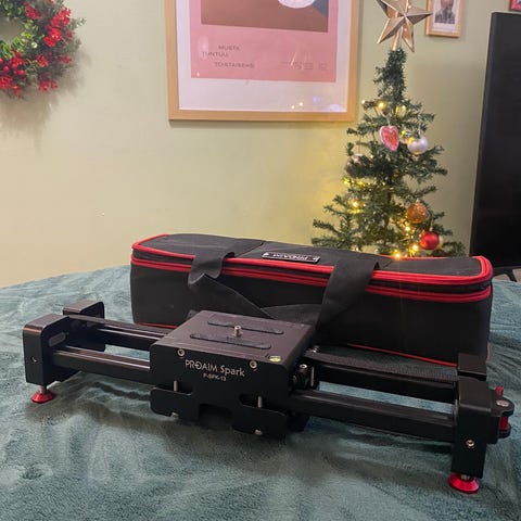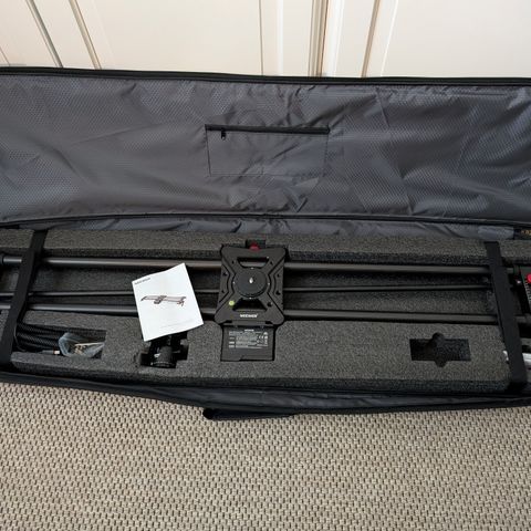 Ammattitasoinen slider 120 cm. Hiilikuiturunko. Kameran kulkuradan pituuden ja nopeuden voi säätää, Jalusta kääntyy automaattisesti mukana ”polttopisteen” mukaisesti. Myös loop-toiminto.