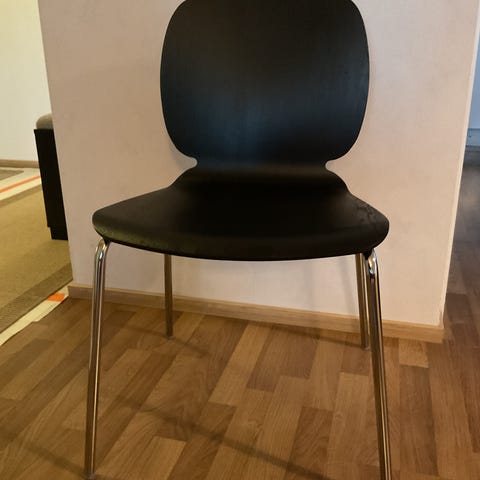6 kpl hyväkuntoiset Ikean mustat tuolit, puuviilu-istuin, kromatut jalat.