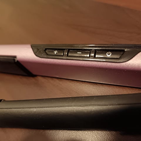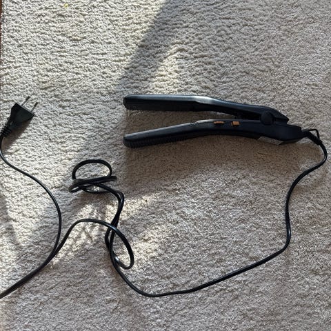 Suoristusrauta leveillä suoristuslevyillä. Johdossa paneeli mistä saa päälle ja pois päältä sekä säädettyä lämpötilaa. Johto ulkomaille sopivalla plugilla, mutta mukana adapteri Suomalaisiin pistokkeisiin.