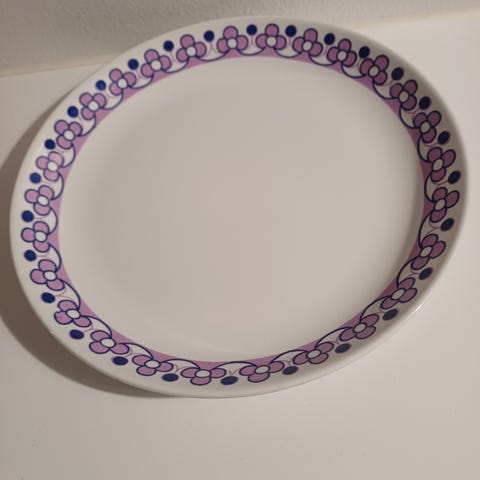 Riikka tarjoululautanen/tarjoiluvati 70-luvulta. Hyväkuntoinen, kirkas lasite jossa hentoja pintanaarmuja tarkalla silmällä katsottaessa. Ei kolhuja, reunassa yksi tumma viiva ks. lähikuva. Tämä ei ole halkeama/kolhu.