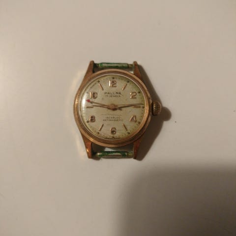 Myydään Pallas 17 Jewels rannekello. Vedettävä. Swiss made, water proof. Kellotaulun halkaisija noin 2 cm. Mahdollisesti 1950-luvulta.