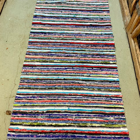 Iso vaaleansininen räsymatto by Rasinmäki. Koko 77 × 244 cm. Kuvissa näkyvät maton molemmat puolet. Vastapesty. Pieni vaalea tahra (kuva 3), joka on ainoastaan maton nurjalla puolella.