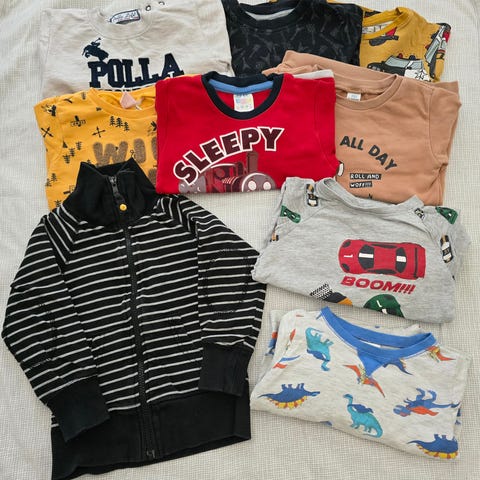 Pieni vaatepaketti, jossa 3kpl t-paitoja ja yhdet shortsit. Printit hieman kuluneet, muuten ehjä, käytetty kunto.