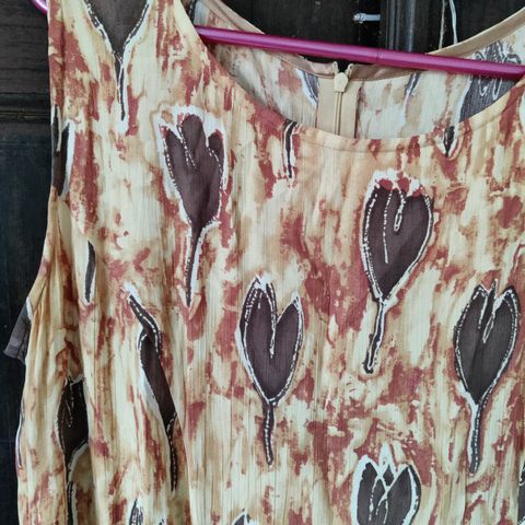 Puuvillaa. Hyväkuntoinen. Musta, kuvioita. Kaunis päällä. Ei jousta. Kevyt vuori. Sivulla vetoketju.