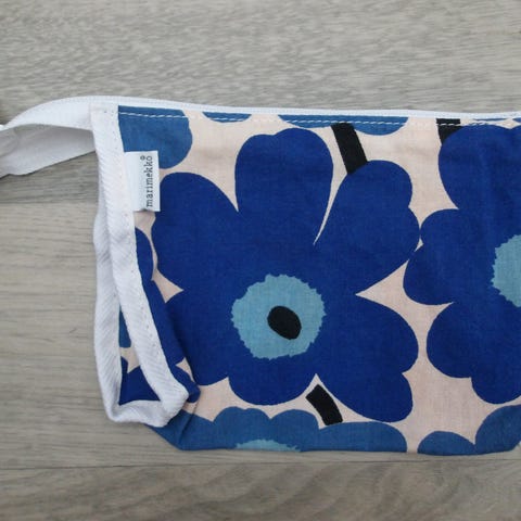 Marimekon vaaleanpunainen unikko pussukka/kukkaro/penaali. Käytetty penaalina, joten kynistä on tullut sisäpuolelle paljon väriä sekä vähän pussukan toiselle puolelle tussia. Olen yrittänyt putsata, mutta en saanut lähtemään. Jollakin aineella saisi kyllä varmasti jäljet pois.